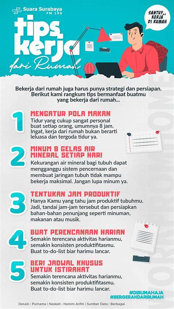 Jadi, siap untuk mencoba tips di atas dan menjadi versi terbaik diri Anda saat bekerja dari rumah? Jangan lupa untuk membagi cerita sukses Anda dan tips yang telah berhasil Anda terapkan kepada orang lain! Terus semangat dan tetap produktif!